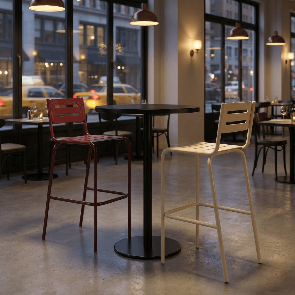 Minimalist and durable, this powder-coated steel bar stool features clean lines, a supportive backrest, and a sturdy footrest—perfect for indoor or outdoor bar and counter settings.